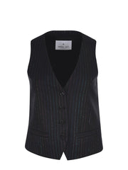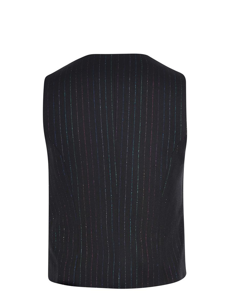 Manuel Ritz Wool Blend Vest Black. Fully lined. Two front welt pockets. Button closure. Multi-color lurex stripe.