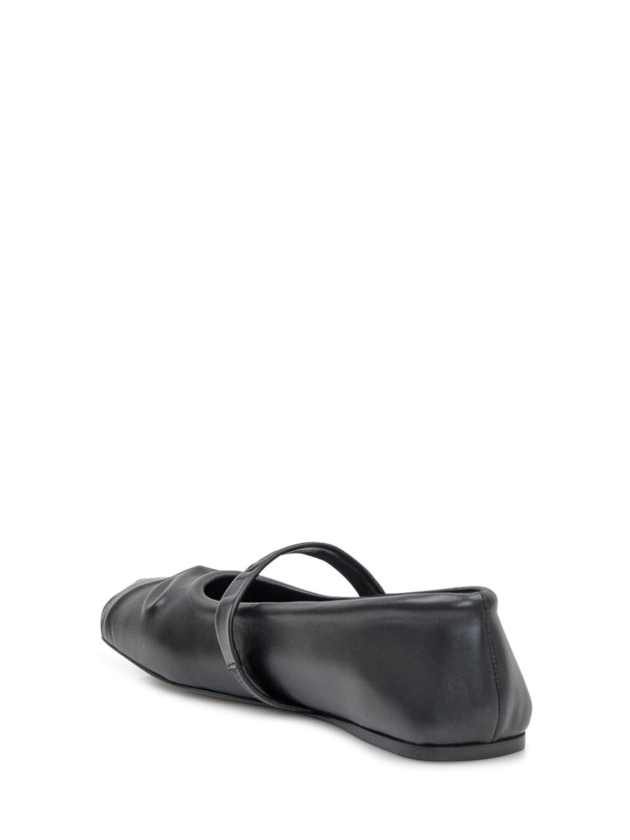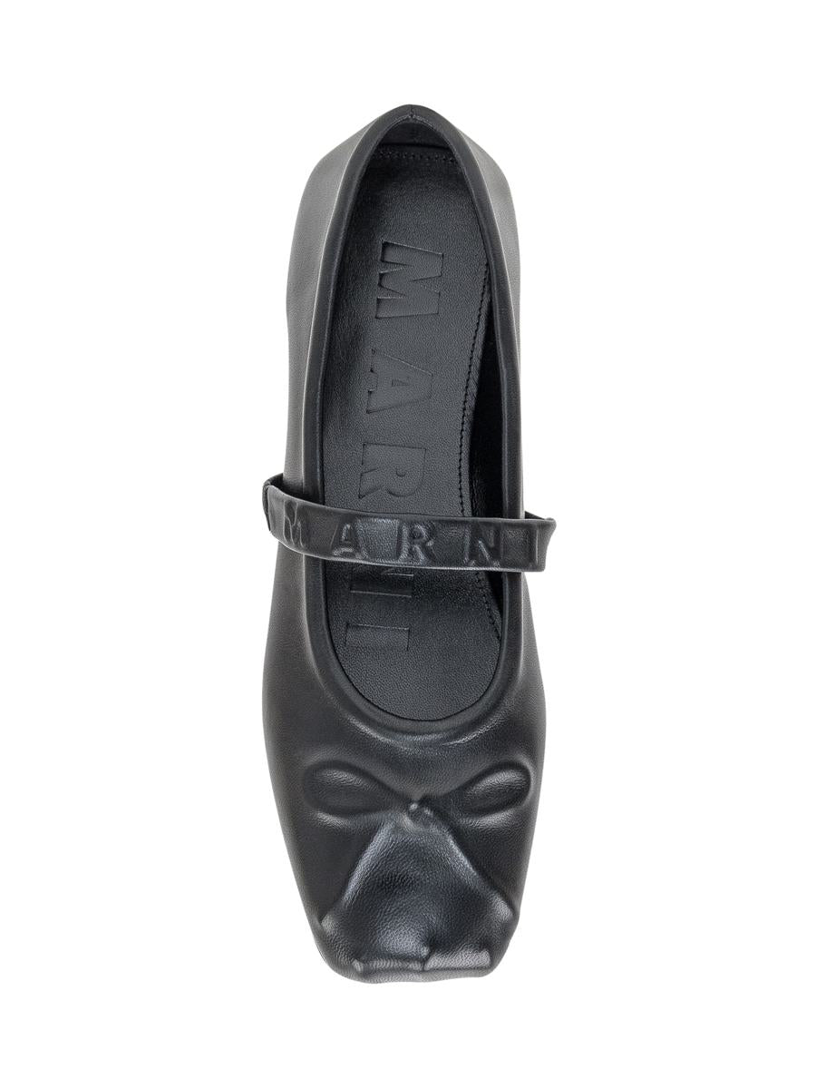 Black leather ballerina. Embossed bow. Elasticated strap.