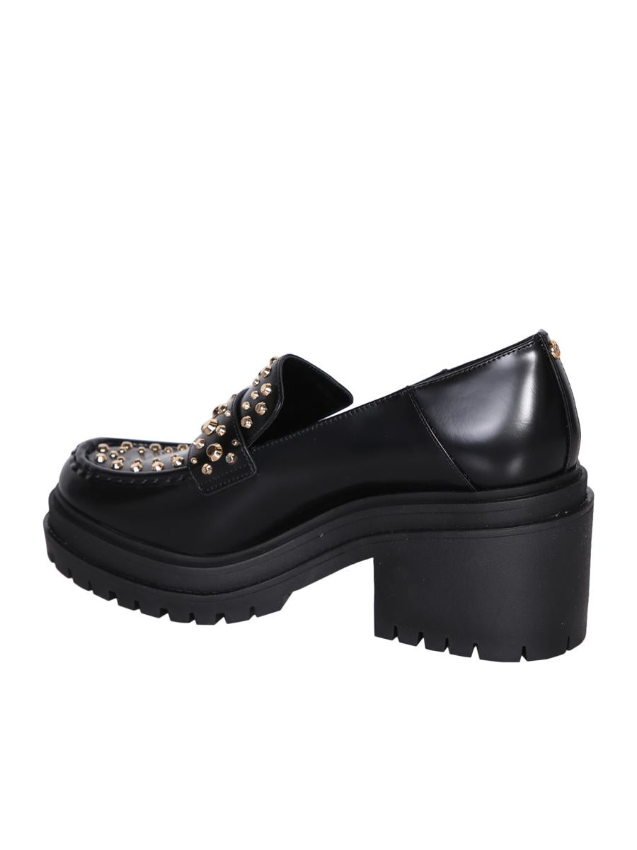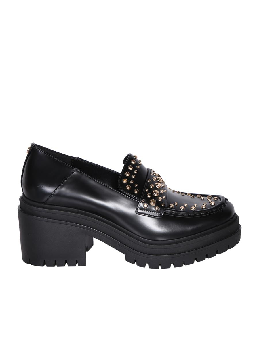Black leather loafers. Gold-tone stud embellishments. Sturdy heel and lug sole.. The Michael Kors Rocco Black Loafer features a bold silhouette and gold stud details, adding a touch of rock-chic glamour to the classic everyday shoe