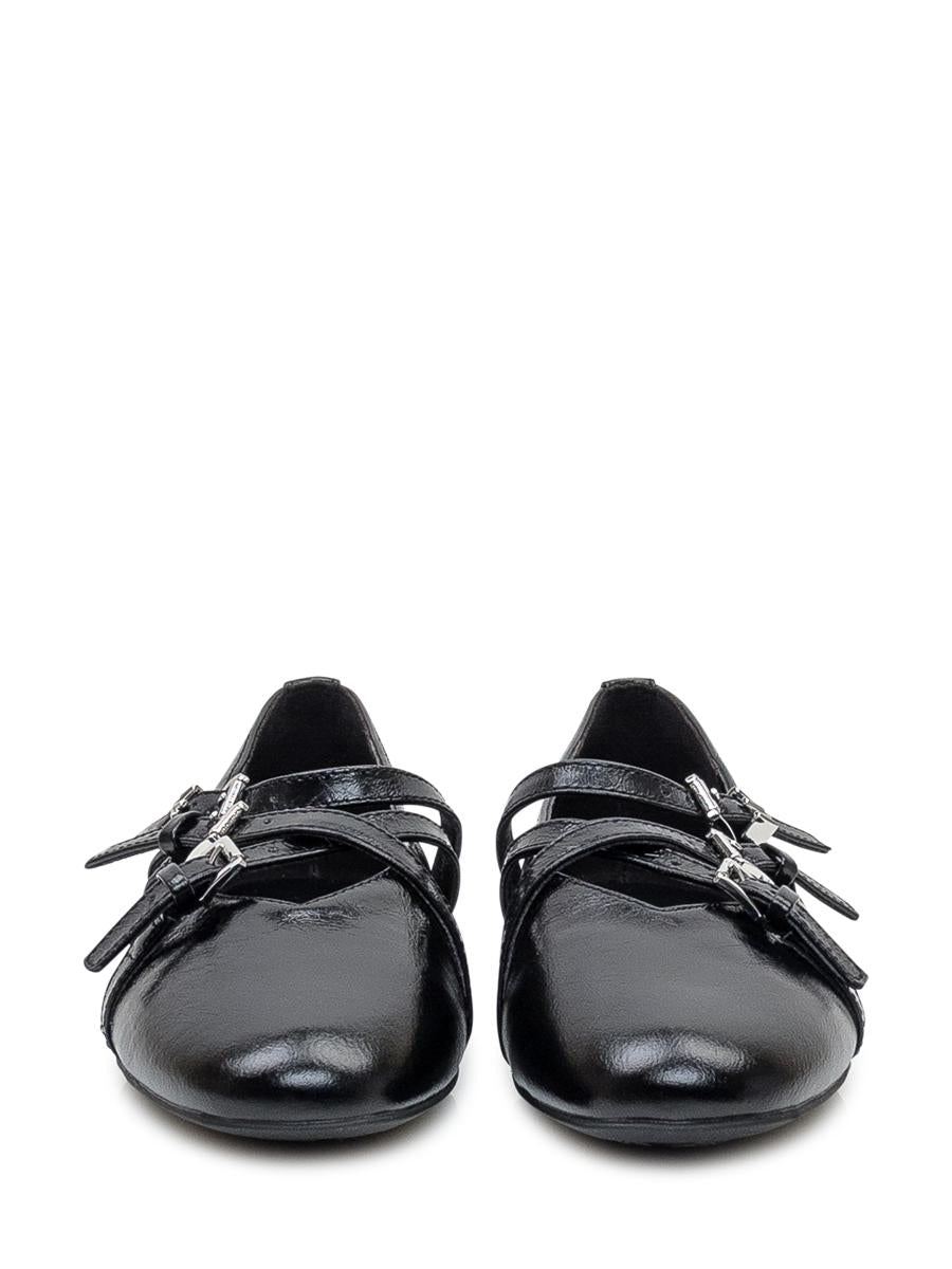 Black leather ballerina. Shiny effect with patent leather. Laces on the front.