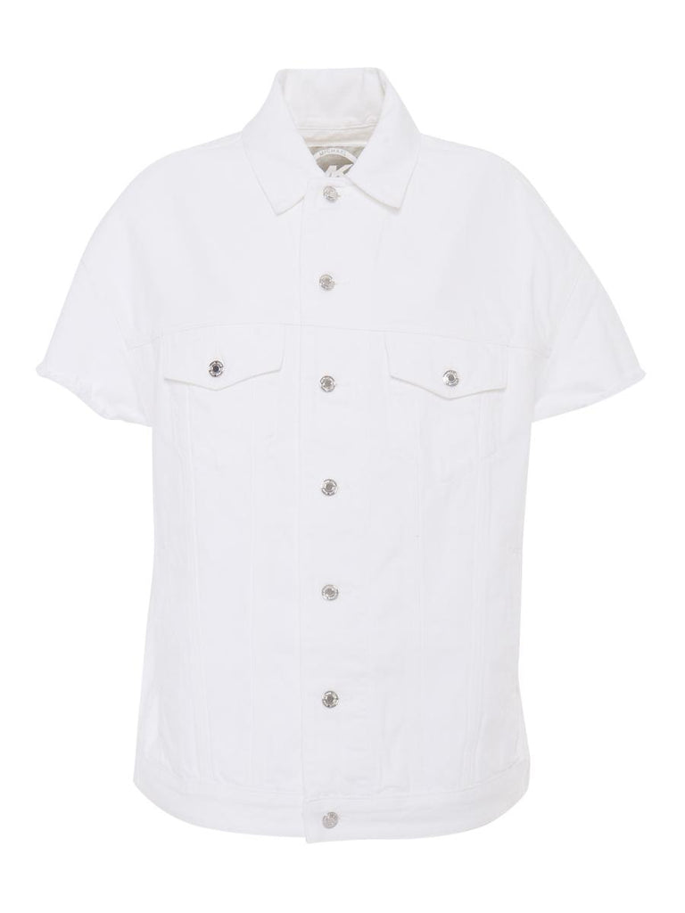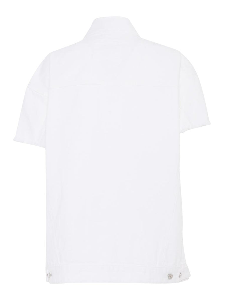 White women's denim jacket White women's denim jacket with short sleeves, classic collar, front patch pockets, front buttons.