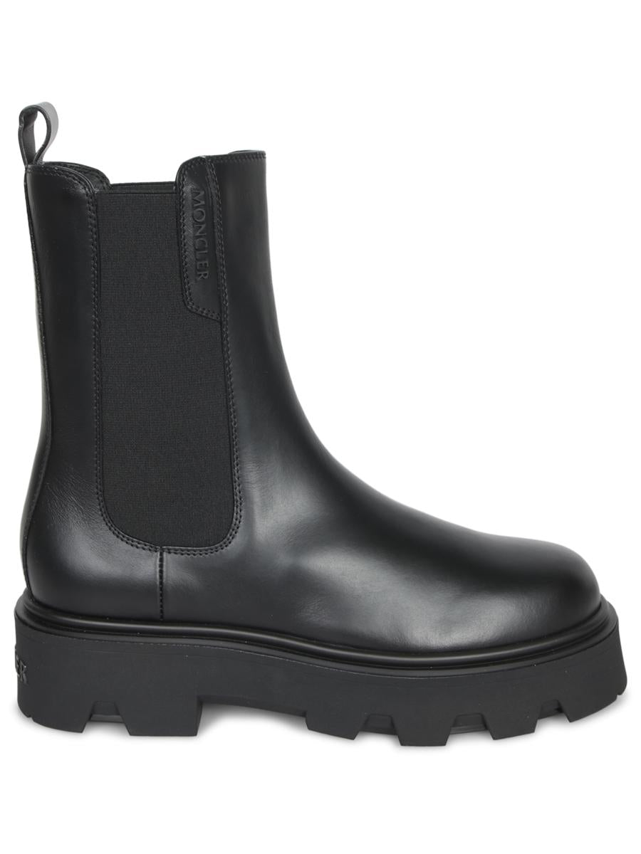 This sleek Moncler Chelsea boot stands out with its sturdy rubber sole and elegant black leather finish. Perfect for a sophisticated urban look.
