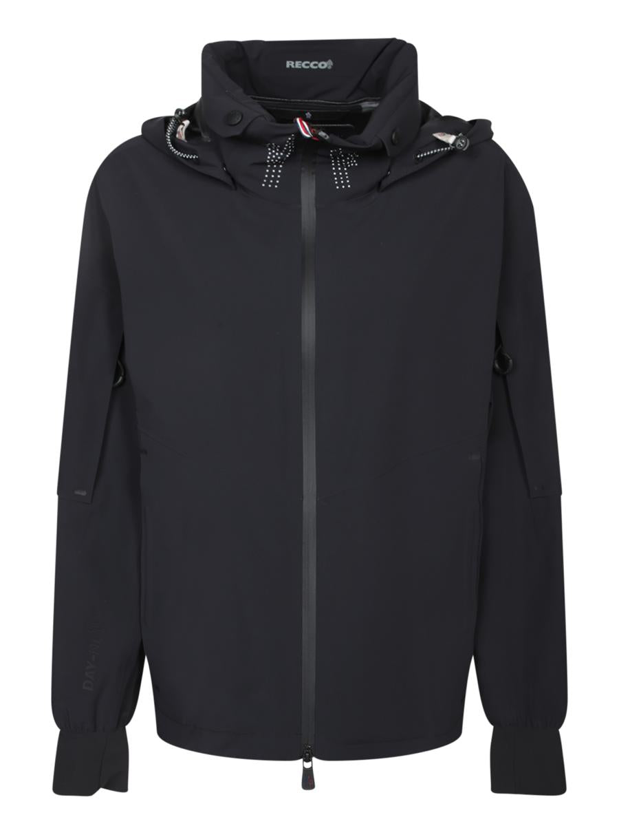 Black bomber with integrated hood, front zip closure, and reflective details.. This exclusive black bomber by Moncler Grenoble features a hood embellished with reflective details for optimal visibility. The secure zip closure and technical finishes ensure uncompromised comfort and functionality