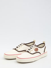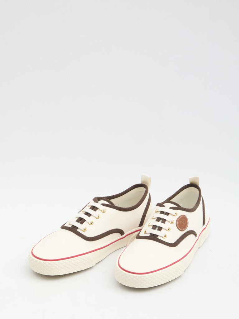 Nojoke sneakers in cream canvas fabric with brown trim. They feature a leather patch with Vlogo signature detail and a rubber sole. Dust bag included. Additional laces included. Any leather imperfections are not to be considered manufacturing defects, but a peculiarity of the material.
