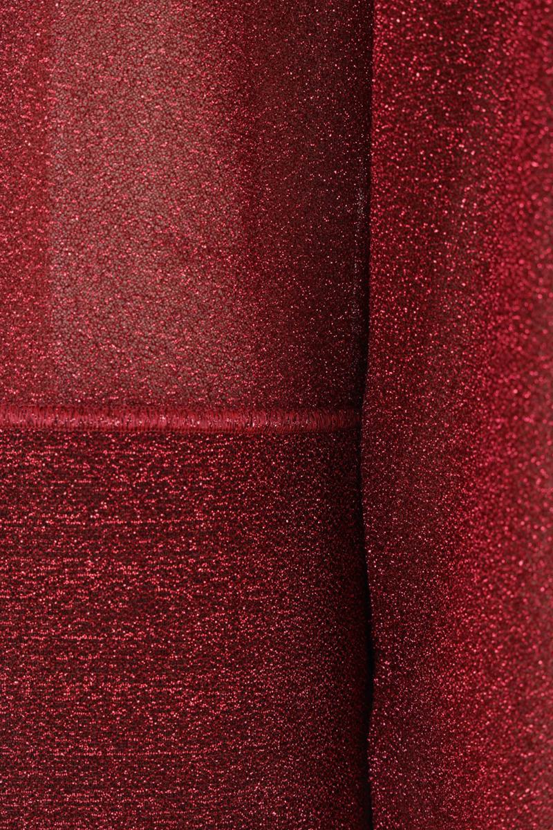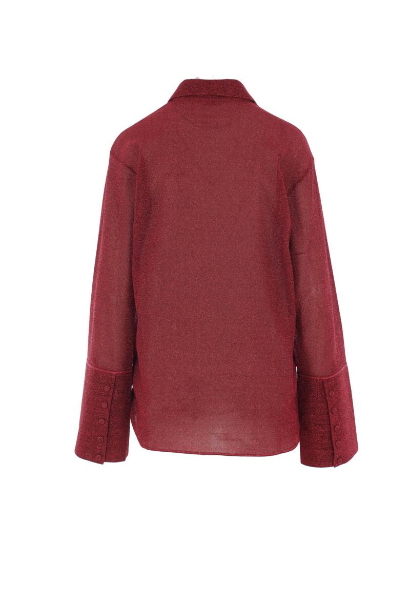 Oséree shirt crafted from burgundy lurex. Featuring a pointed collar, button closure, long sleeves with tall buttoned cuffs, and a rounded hem.