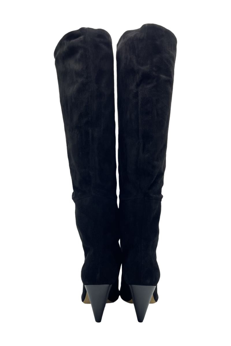 Proenza Schouler Cone Knee High Boots in suede, tapered fit through the leg, angular heel.