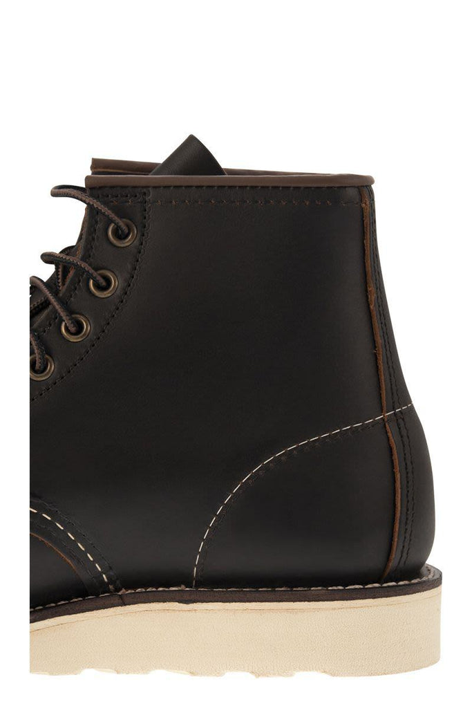 The 6-inch Classic Moc is synonymous with Red Wing Heritage. The unmistakable moc toe and Traction Tred sole form a silhouette that sets the standard by which all others are measured. It was first produced by Red Wing in 1952. It has since become one of the world's best-loved lifestyle boots. - Durable construction - Constant traction and all-day comfort - Triple Puritan stitching - Goodyear welt DESIGNER ID: 08849D NERO