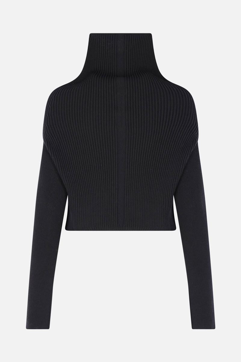 Rick Owens cropped sweater crafted from black wool knit with ribbed detailing. Featuring a cowl neckline, long sleeves, and a straight hem.