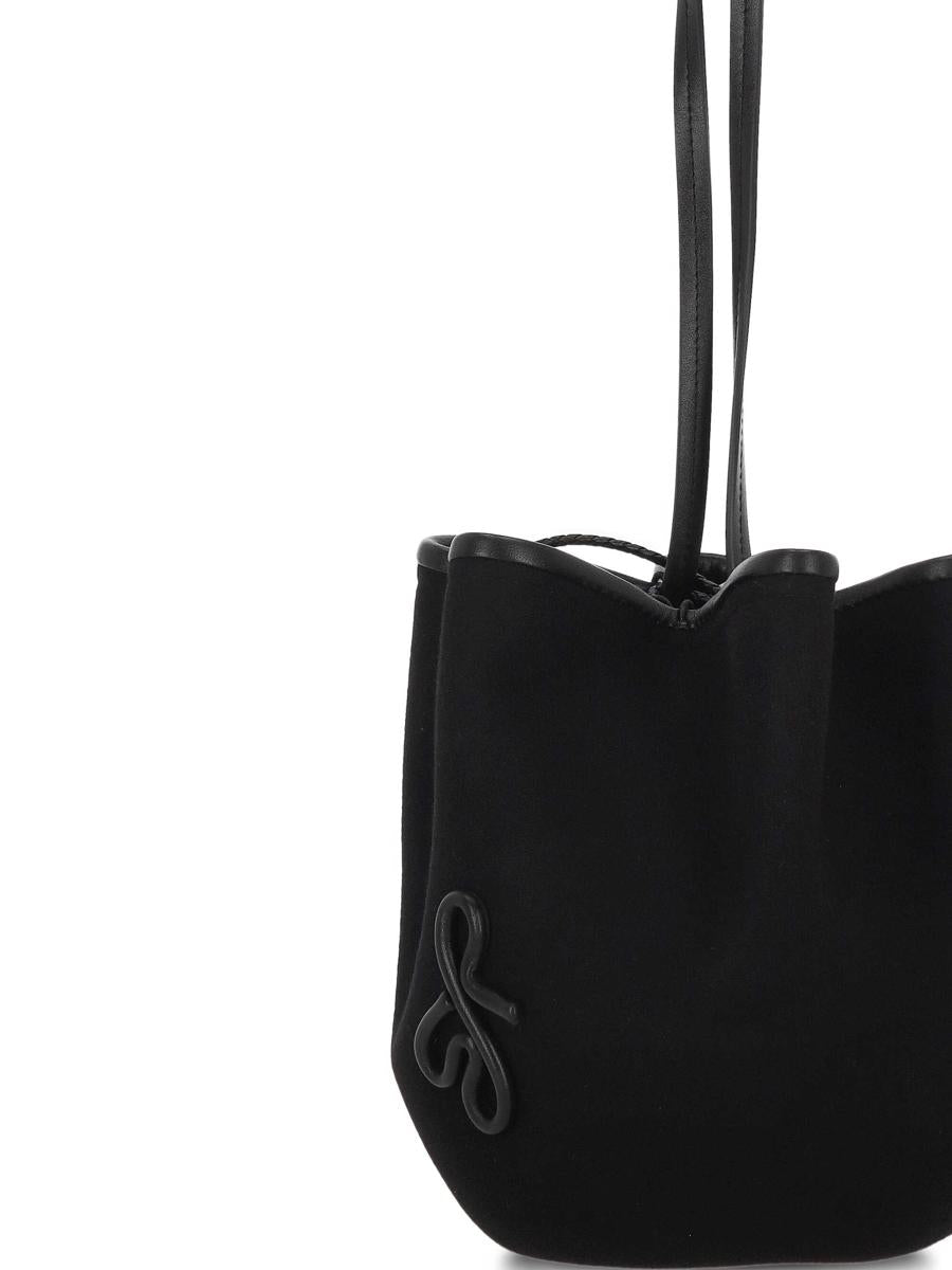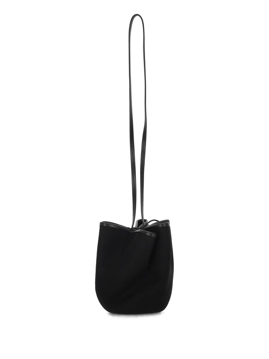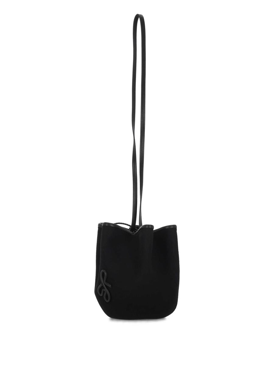 black drawstring closure leather shoulder strap logo emblem bucket shape felt material