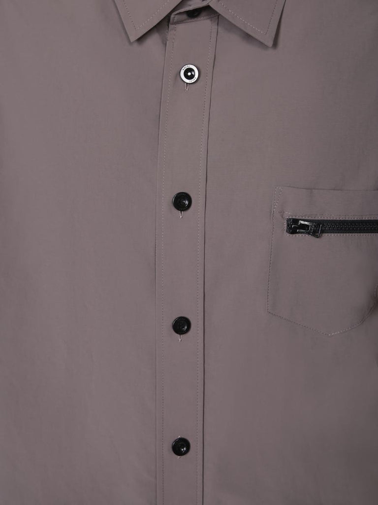 This Sacai taupe matte taffeta shirt features a sophisticated design including a practical front zip pocket, perfect for a contemporary and functional look.