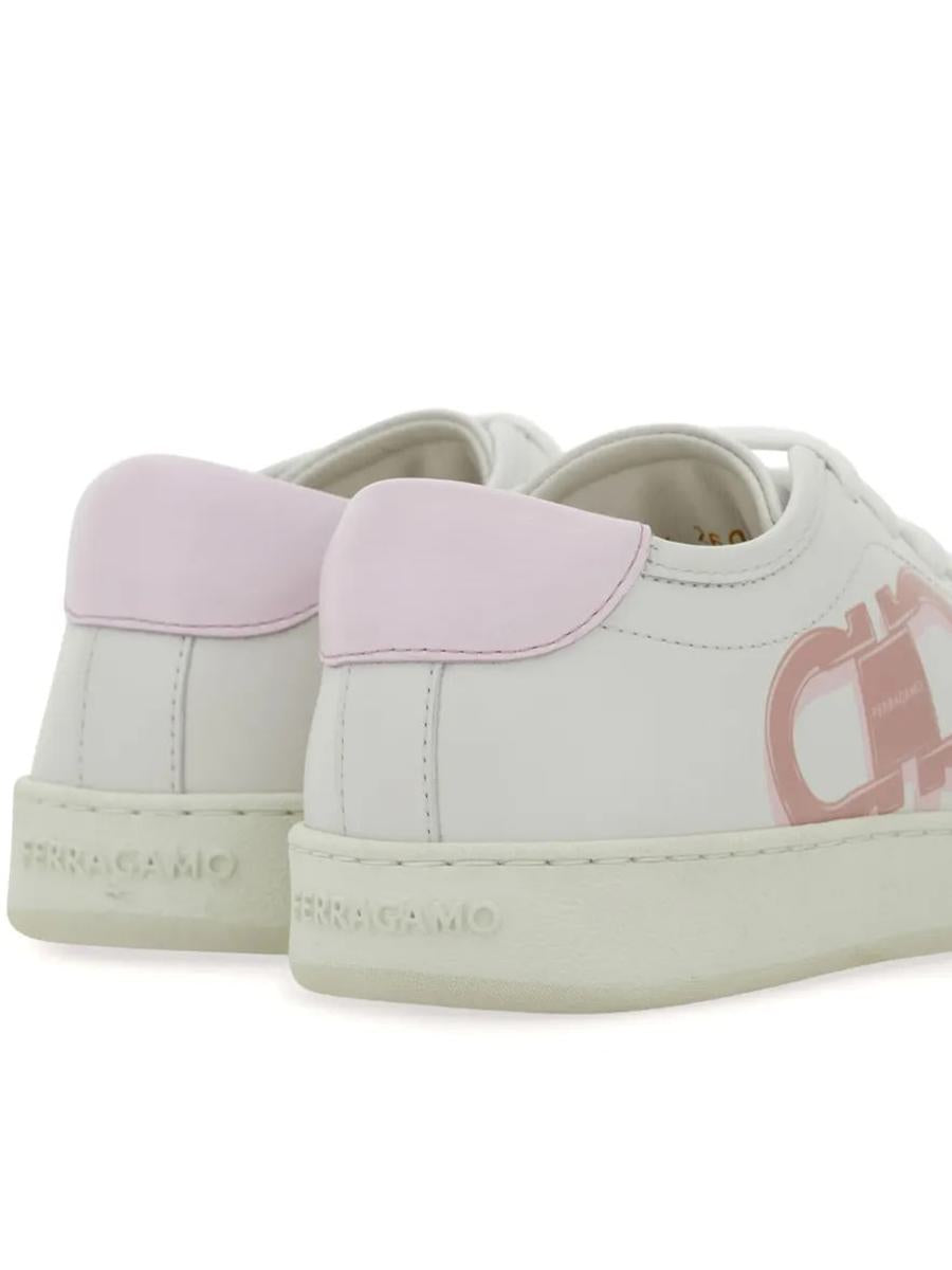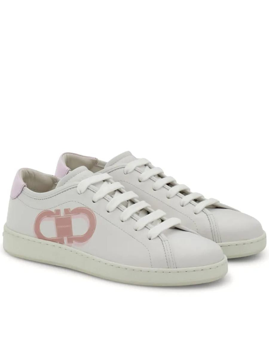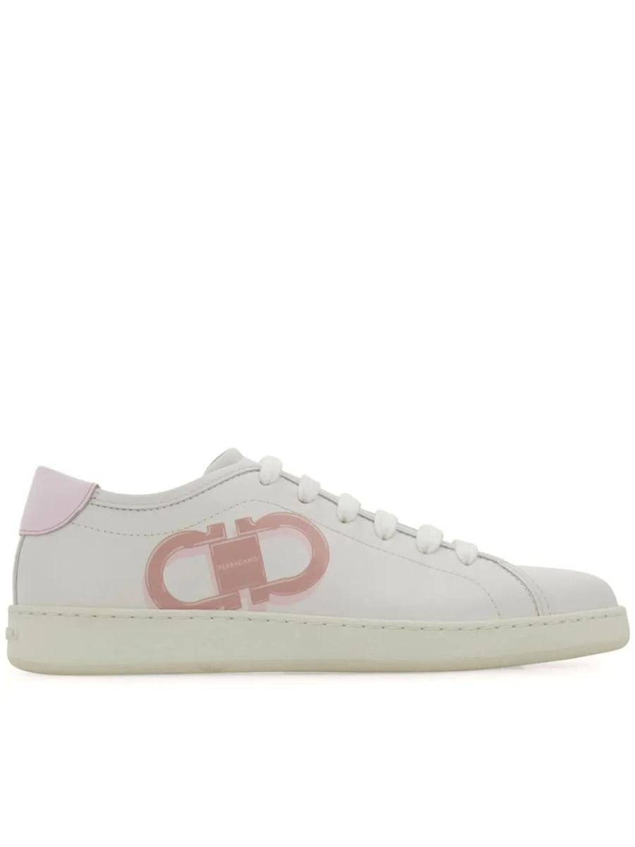 Ferragamo's Double Gancini sneakers, made in Italy, feature a lace-up front closure and a flat rubber sole. Gancini print and contrasting heel reinforcement complete the design.