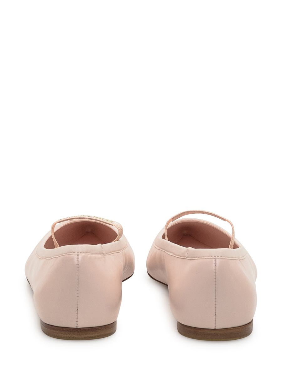 Pink leather ballerina. Pointed toe design. Ribbon closure. Embroidered logo. Reference size: US