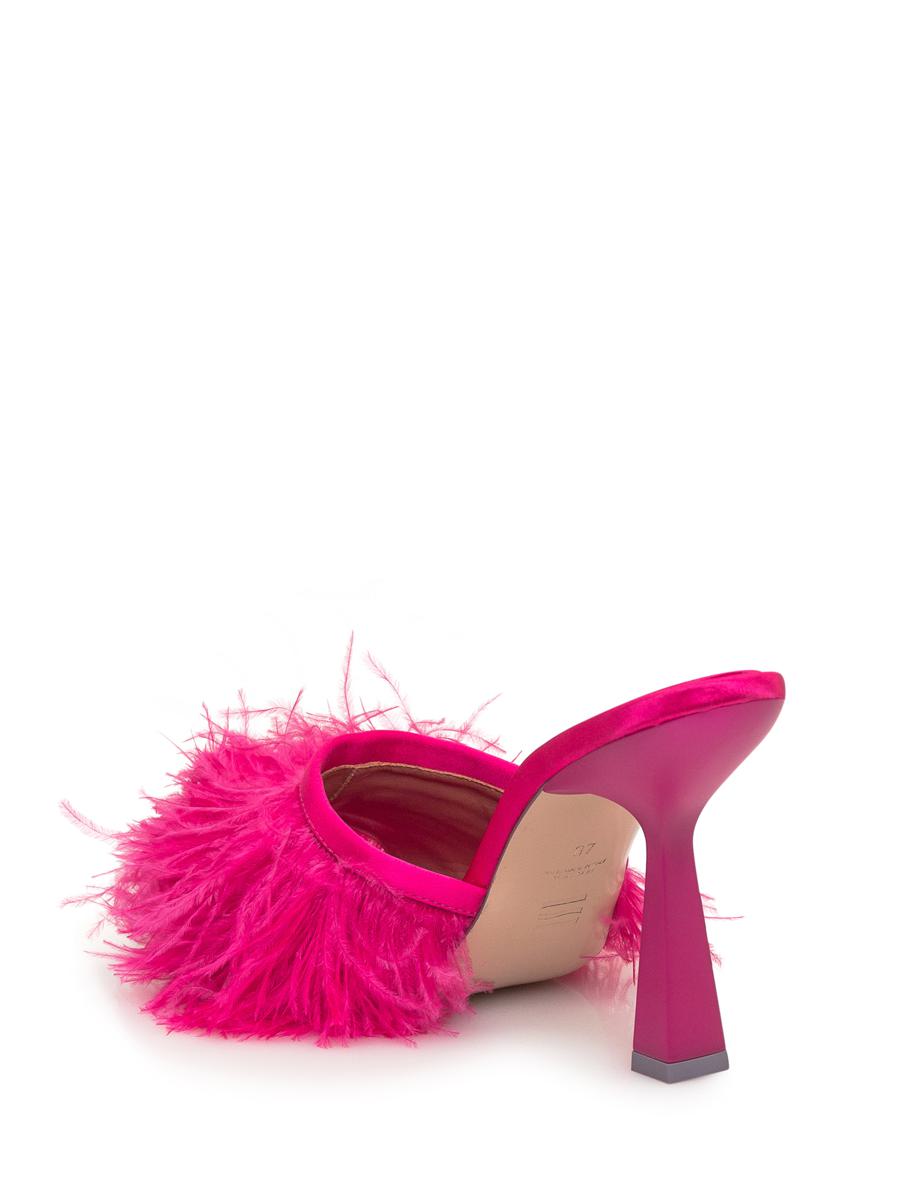 Pink mule with heel. Feathers on the front. Heel height: 10