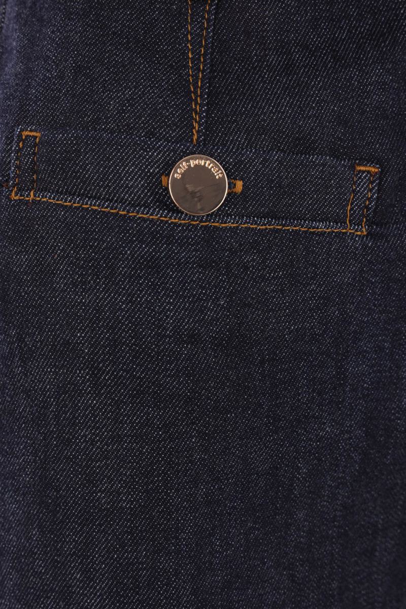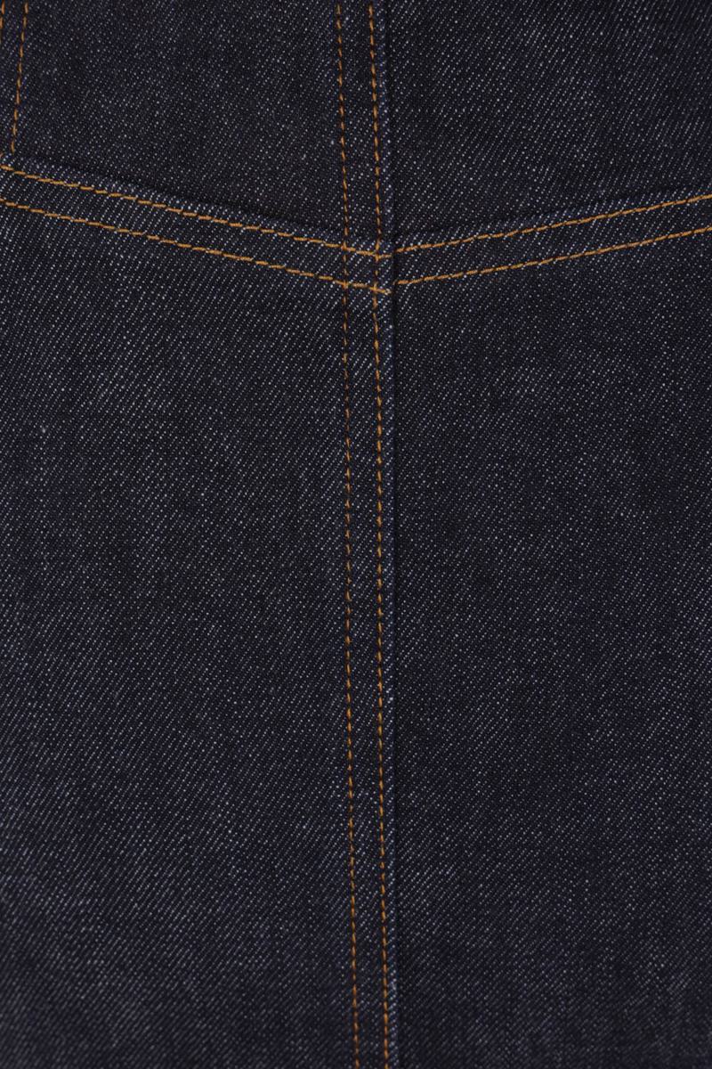 Self Portrait midi skirt crafted from stretch cotton denim in indigo blue with a black leather belt. Featuring a front closure with metal button and zip, belt loops, front welt pockets, and a back slit.