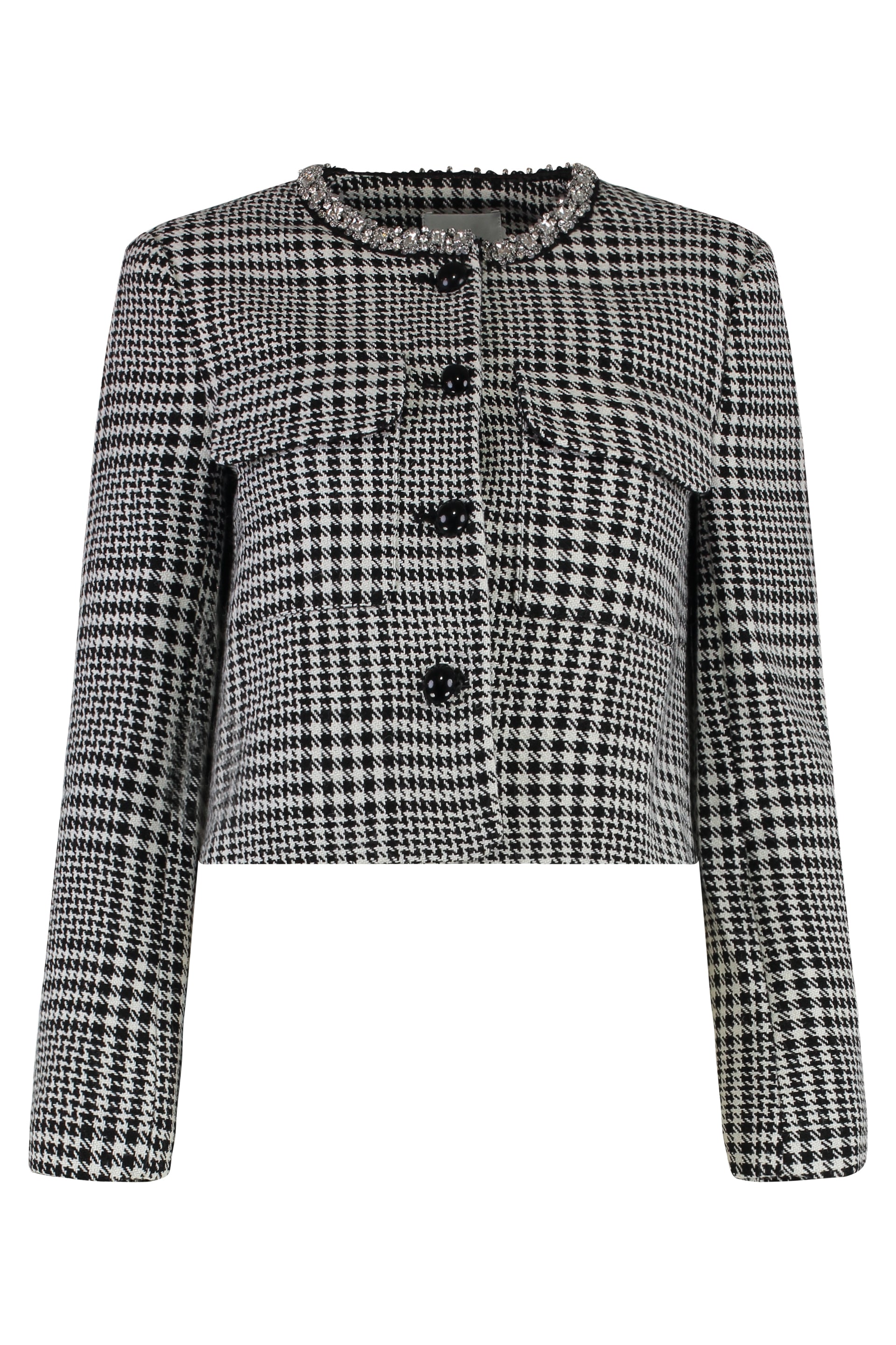Self-portrait houndstooth blazer with tailored construction, made of wool-blend fabric with houndstooth pattern. The design features a fitted silhouette with a front button closure. The garment includes applique rhinestone details, functional pockets and a minimal stretch construction that retains shape. The rigid construction enhances the sharp shoulder cut and fabric finish.