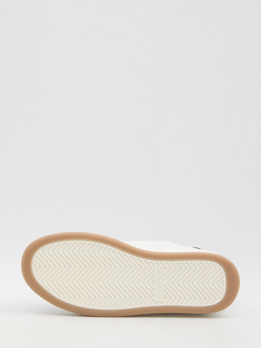 SL/61 low-top sneakers in smooth white leather. They feature a round toe, lace-up closure, gold-engraved logo on the side, logo on the tongue, black leather heel tab with gold-engraved logo on the back, branded insole, and rubber sole. Dust bag and additional laces included. Any imperfections in the leather are not defects but a characteristic of the material.