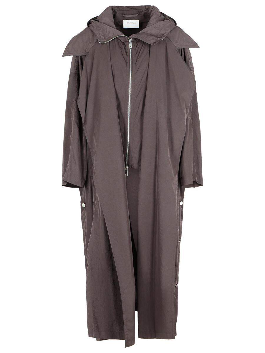Drip-proof taffeta trench coat with oversized fit, maxi lapel collar and inner zipper vest, belt at the waist, high side slits with snap buttons, regular fit