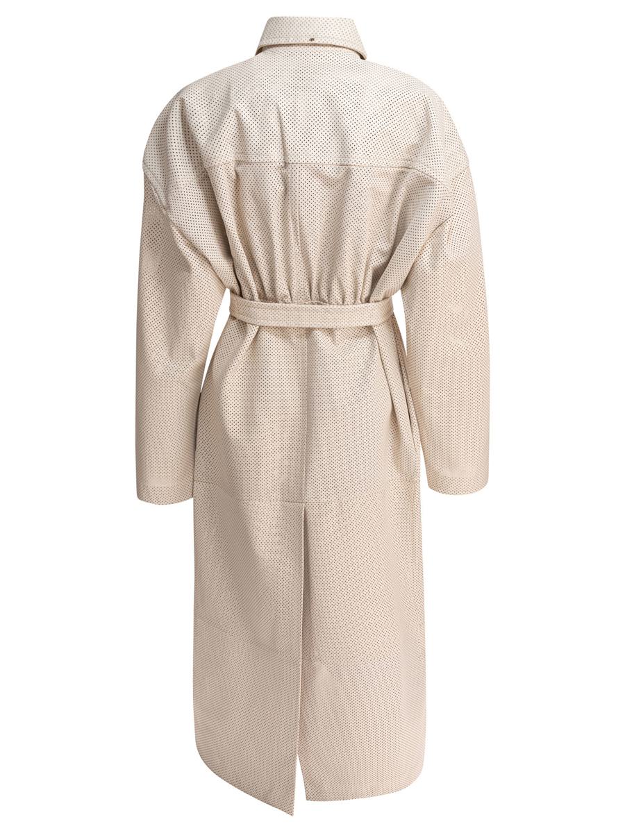 Max Mara Sportmax leather belted trench coat made of perforated nappa leather with a long construction and soft silhouette. Essential structure with dropped shoulders, rounded sleeves, and concealed front fastening completed with a first visible button under the shirt collar. Adjustable belt allows you to modulate the fit. Exposed topstitching detail along the main profiles. The garment has no inner lining.