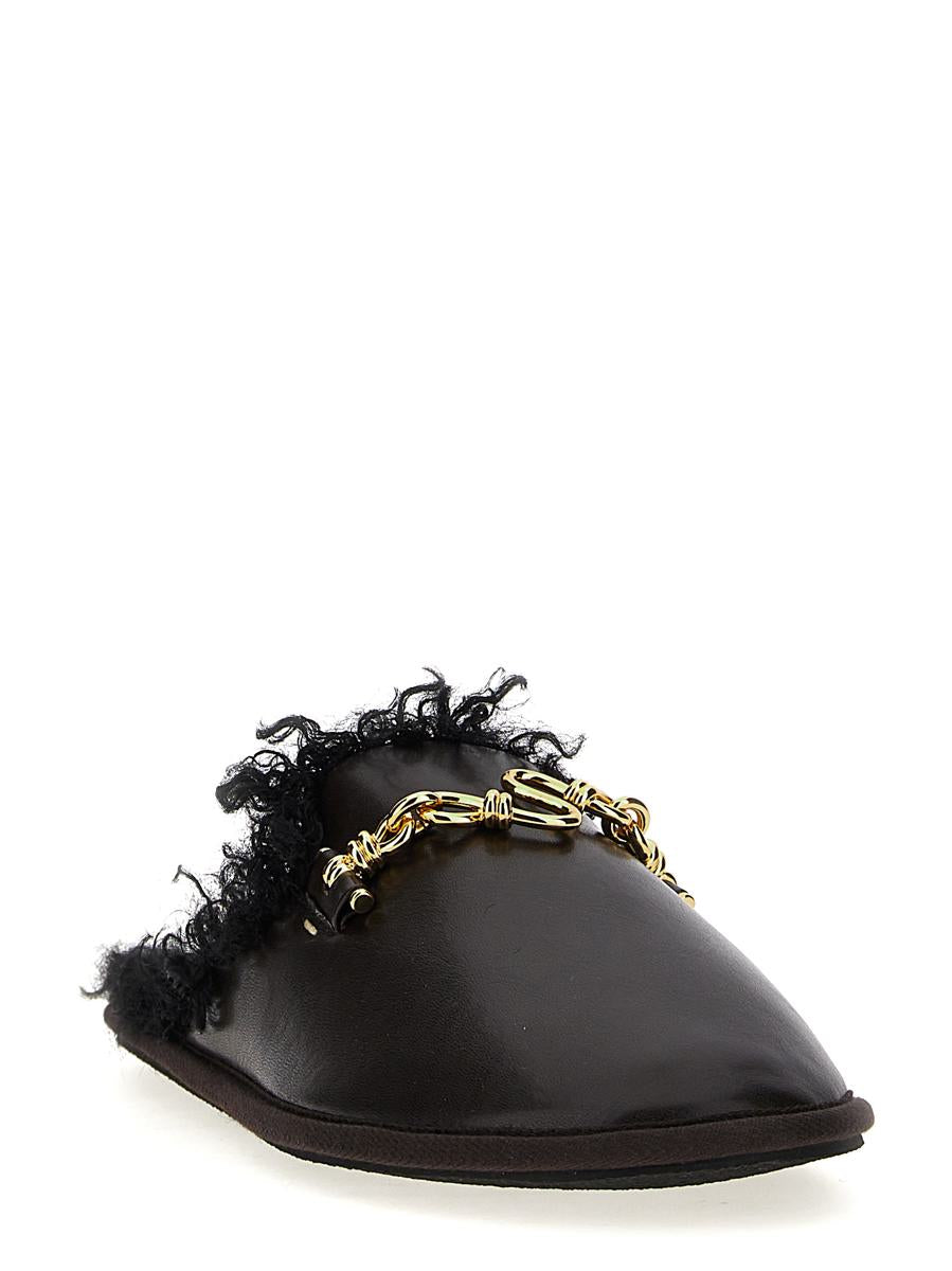 'Backless Ryder' sabots in leather-effect fabric, teddy fabric lined interior, front metal detail, rubber sole