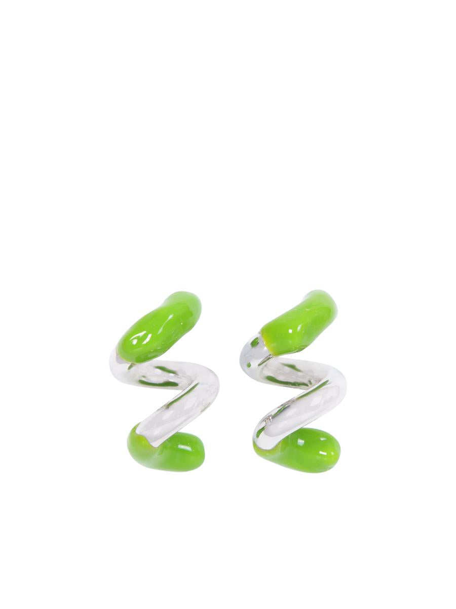 Fusillo Rubberized silver/ green earrings by Sunnei; the brand brings freshness to the fashion system, creating accessories with an innovative and playful design