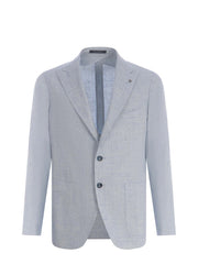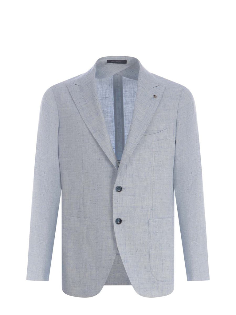 Jacket Tagliatore made of Light Blue linen and cotton blend. Collar with classic lapel. Iconic brand pin applied on the lapel. Long sleeves. Cuffs with four buttons. Welt chest pocket. Single-breasted. Single-breasted closure with two buttons. Patch pockets on the sides. Double vent on the back. Straight hem.