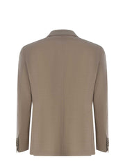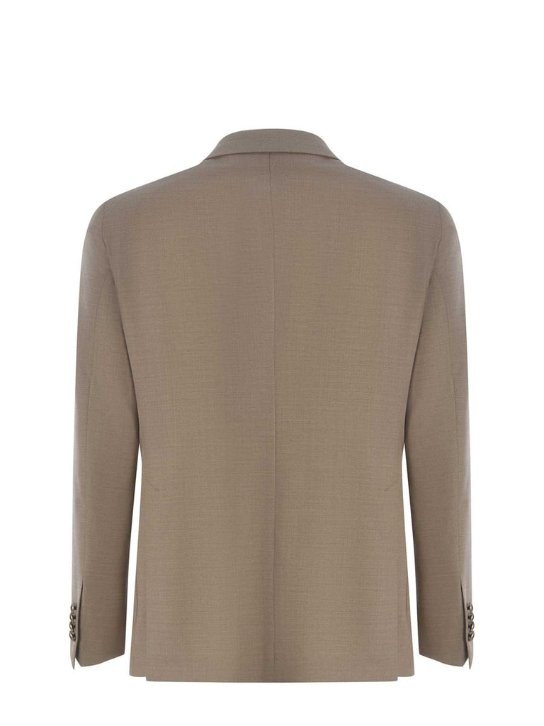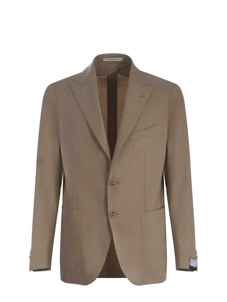 Jacket Tagliatore made of fresh Beige stretch wool. Collar with classic lapel. Iconic brand pin applied on the lapel. Long sleeves. Cuffs with four buttons. Welt chest pocket. Single-breasted. Single-breasted closure with two buttons. Patch pockets on the sides. Double vent on the back. Straight hem.
