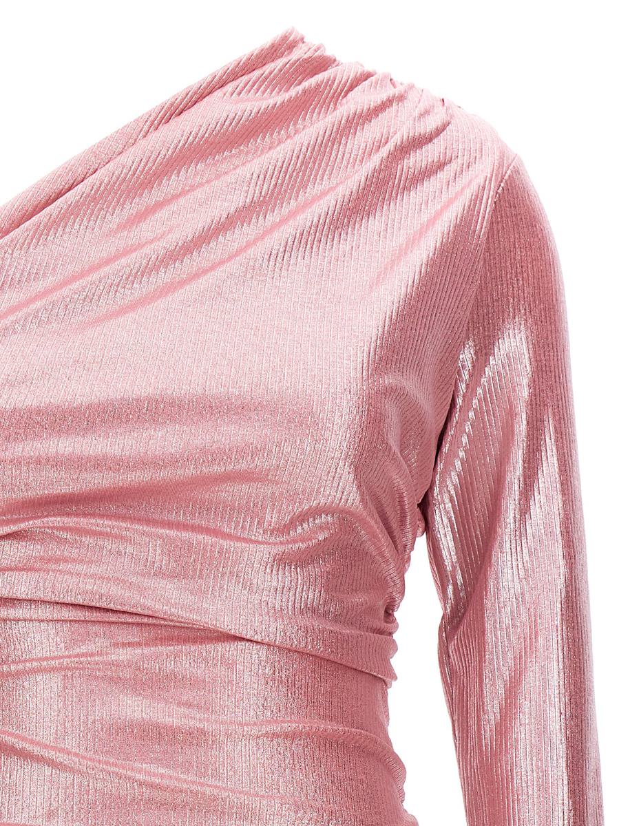 'Olimpia' mini dress in draped stretch lurex ribbed fabric with long asymmetric sleeves and cut-out on the shoulder