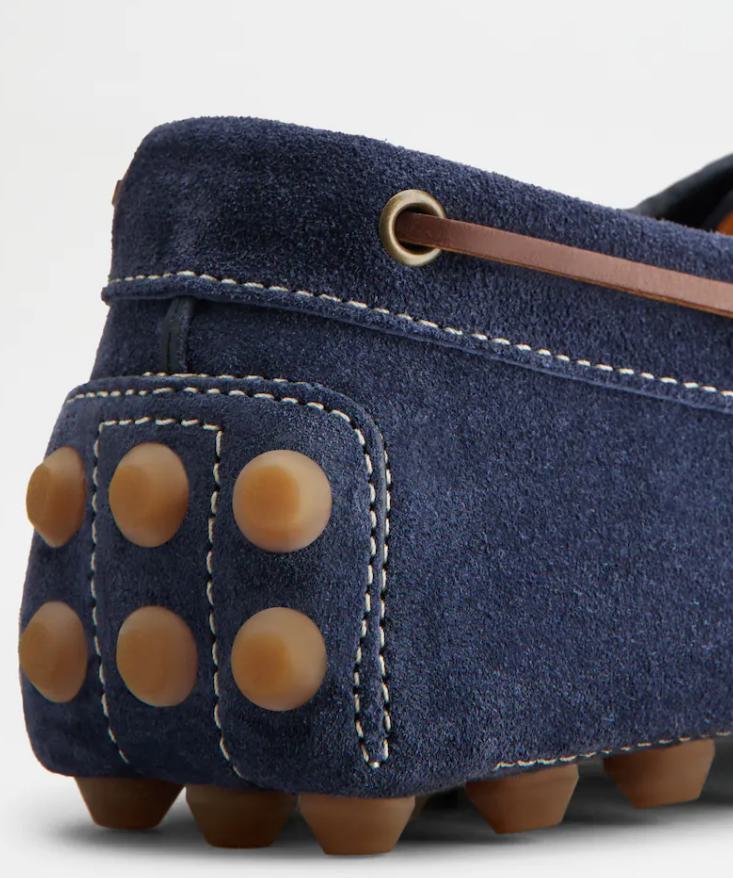 The Gommino Bubble model emphasizes the iconic rubber theme in a contemporary way. The result of careful craftsmanship, it is proposed here in a lace-up version, boat model. Made of refined suede calfskin, it features maxi rubber nubs on the sole and heel.
