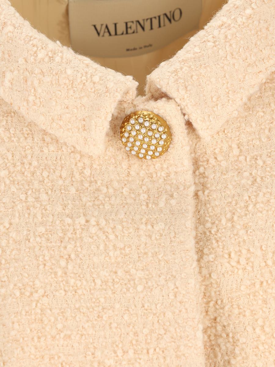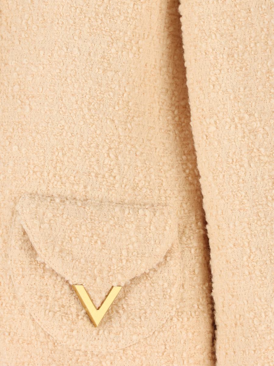 Valentino's virgin wool bouclé jacket with VLogo detailing features a soft, structured silhouette enhanced by the fabric's textural texture and iconic Maison finishes. The short design with rounded collar lends refined, contemporary elegance. - Material: 95% virgin wool, 5% polyamide - Color: beige - Front jewel button closure - Front patch pockets with metal VLogo detail - Slightly cropped line - Made in Italy - Item code: 8B3CE5Y59VMET5
