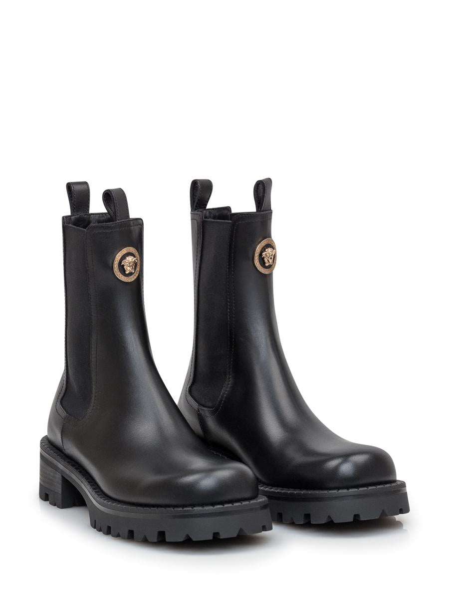 Black leather boots. Chelsea model. Gold La Medusa logo. Elasticized side inserts. Contoured sole. Heel height: 5 Platform height: 2