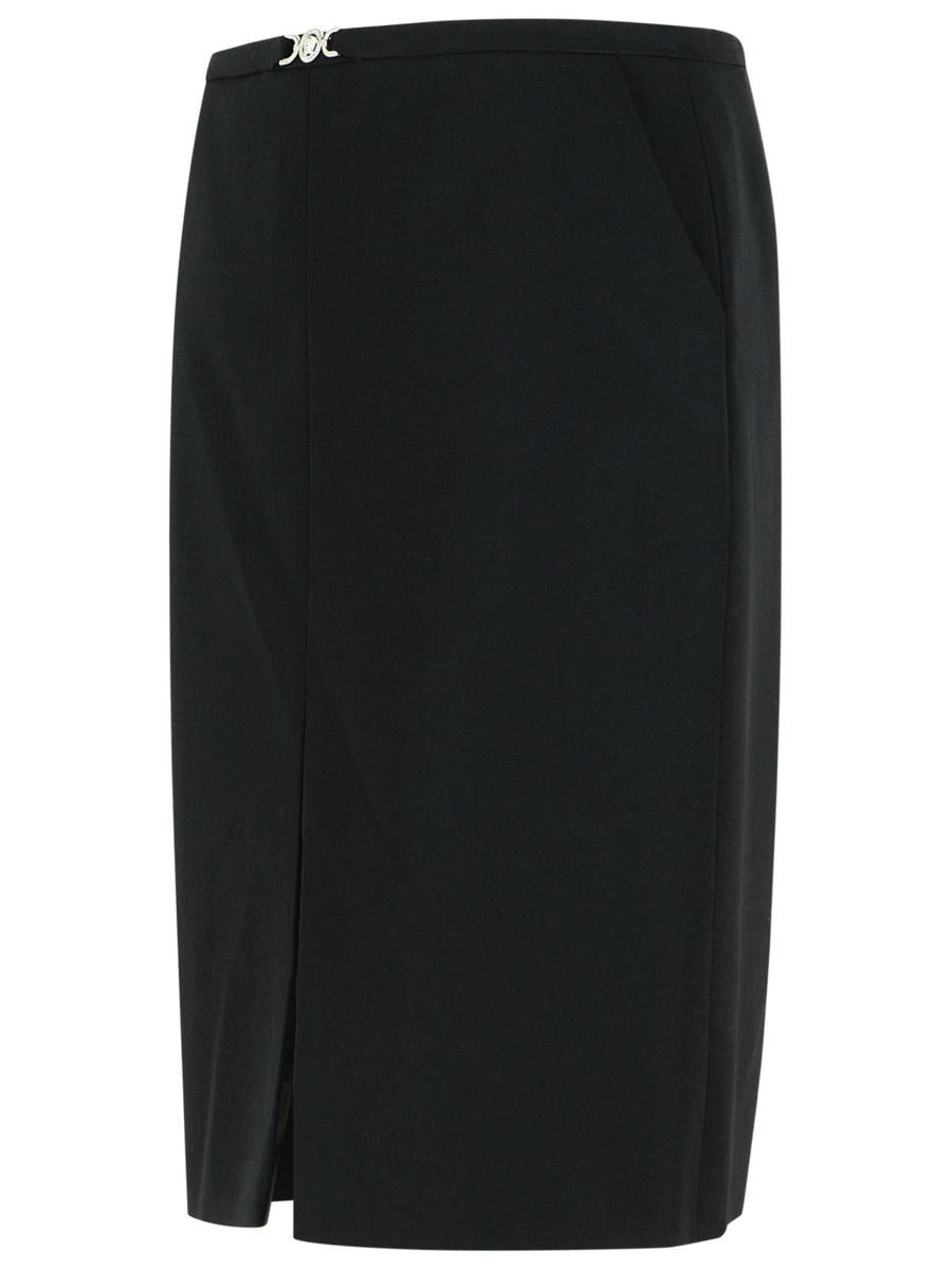 Front 'Medusa' metal decoration, front central split, side slit pockets, invisible back zipper, cupro lining