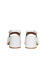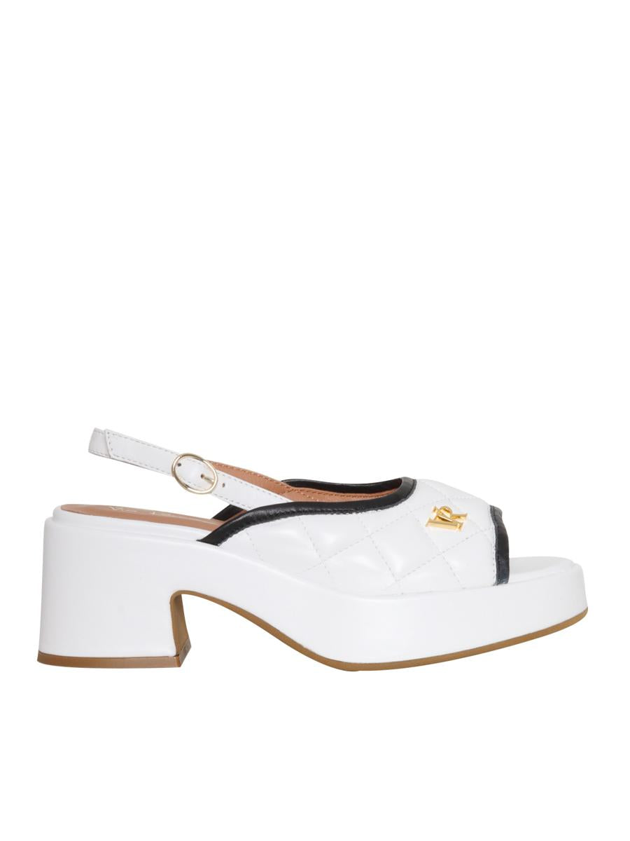 White leather sandals White leather sandals with quilted upper, ankle strap, wide heel, platform, contrasting gold metal logo.