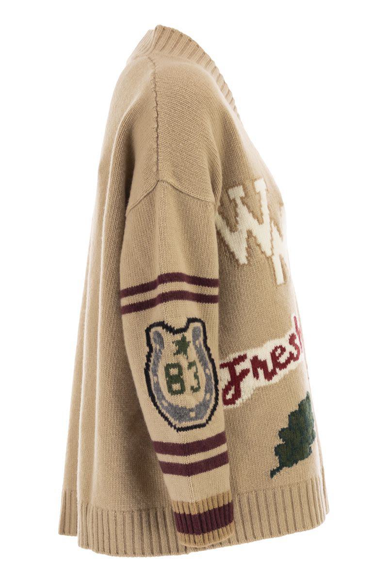 Overfit cardigan in pure wool yarn, embellished with an intarsia pattern on the front and sleeves. - V-neck - Long, low-cut sleeves - Front button fastening - Ribbed finished edges DESIGNER ID: 2525346082600 004