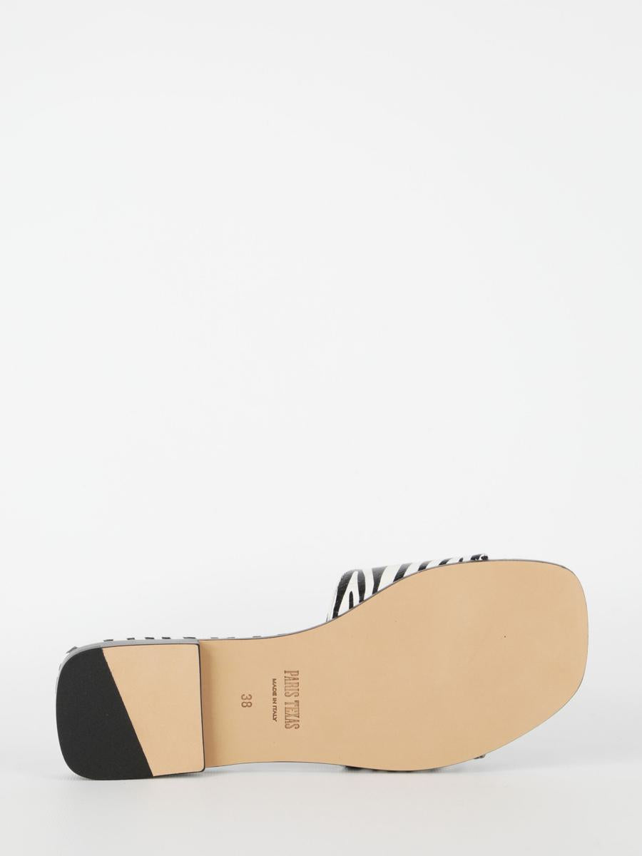 Flat sandals in black and white zebra-print leather. They feature upper brand, round and open toe and Paris Texas logo engraved on the insole.