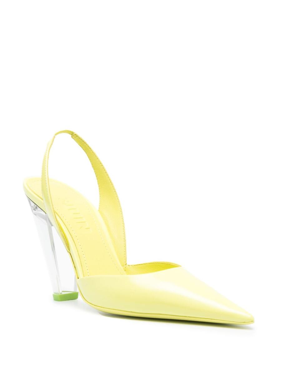 105mm leather pumps from 3juin featuring yellow, calf leather, pointed toe, branded insole and transparent tapered heel.