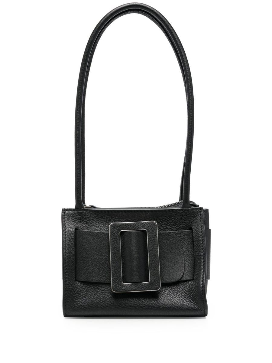 BOYY的Bobby搭扣手提包。黑色、小牛皮、装饰性搭扣细节、系腰带、顶部两个长提手和顶部拉链。