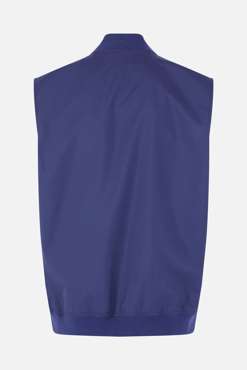 Brunello Cucinelli vest crafted from aviation blue nylon with the Solomeo logo printed on the chest. It features a bomber collar, front double-zip closure, zip pockets, and ribbed knit edges. Unlined interior.