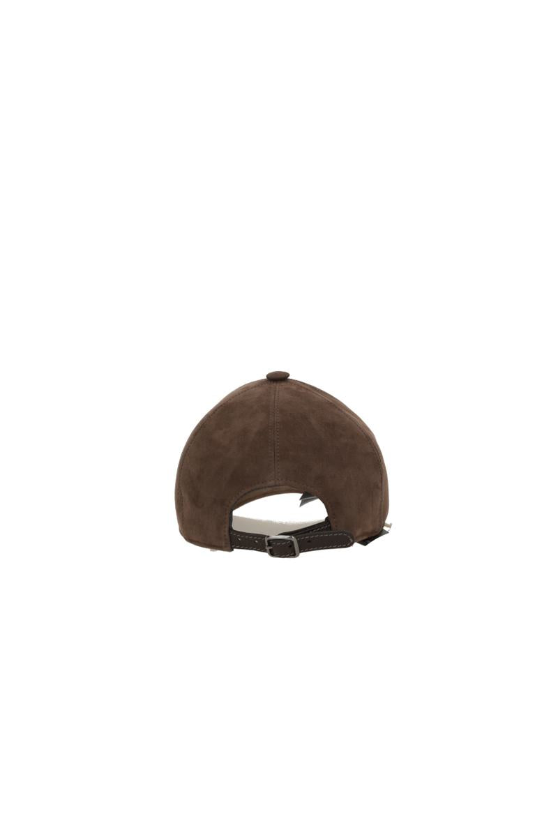 Brunello Cucinelli baseball cap crafted from dark brown suede with rows of sparkling monile embroidery. Featuring an adjustable back strap with metal buckle and a lined interior.