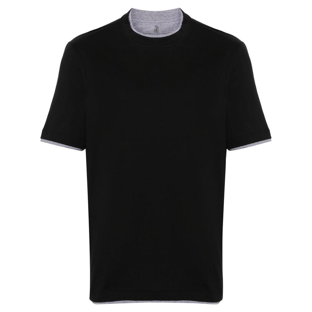Black cotton jersey texture layered effect crew neck short sleeves straight hem