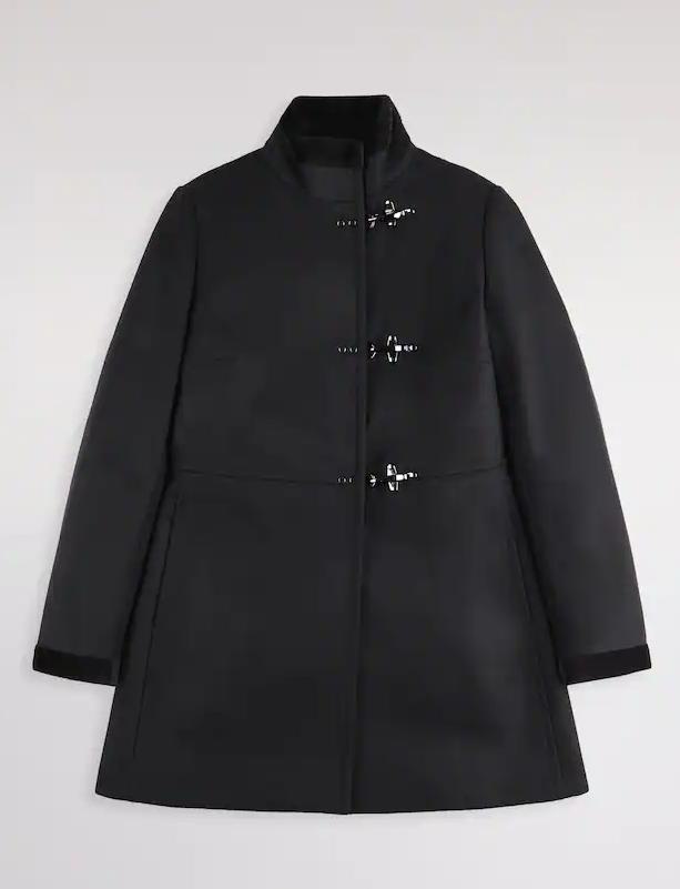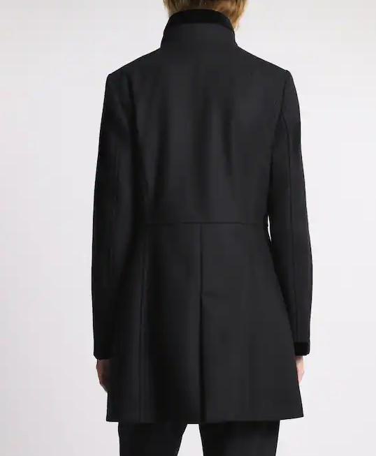 Featuring a wide wrap collar and soft velvet trim, it's embellished with a three-hook closure. Crafted from a soft wool blend, it features welt pockets and an internal label with the item's name.