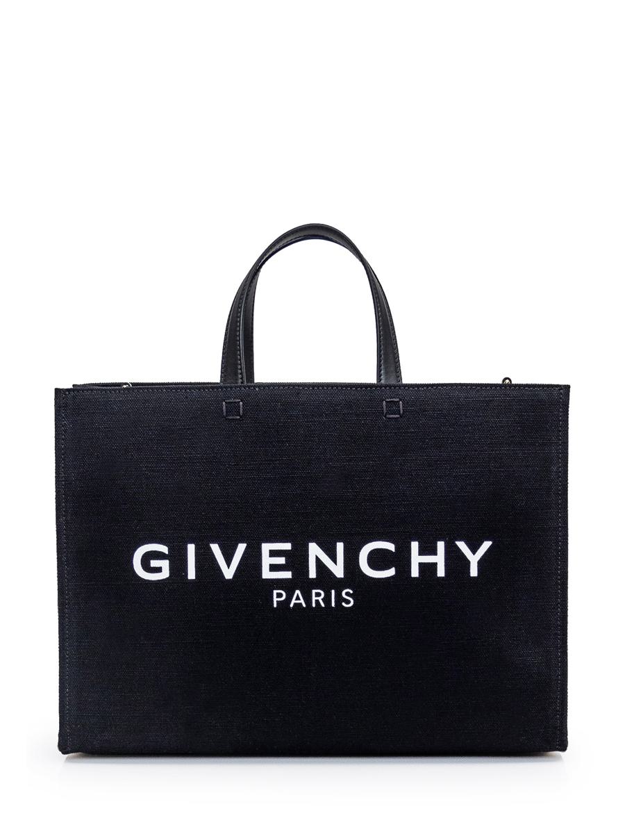 Black canvas handbag. Two leather handles. Removable GIVENCHY webbing shoulder strap with leather details. Flat pocket inside. GIVENCHY paris logo printed on the front. Width: 37 Height: 27 Depth: 13