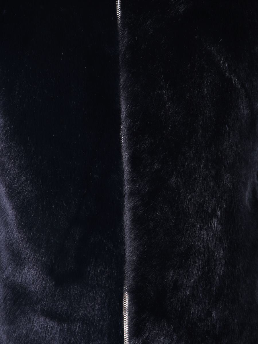 High faux fur collar. Long shiny nylon sleeves. Front zip closure.
