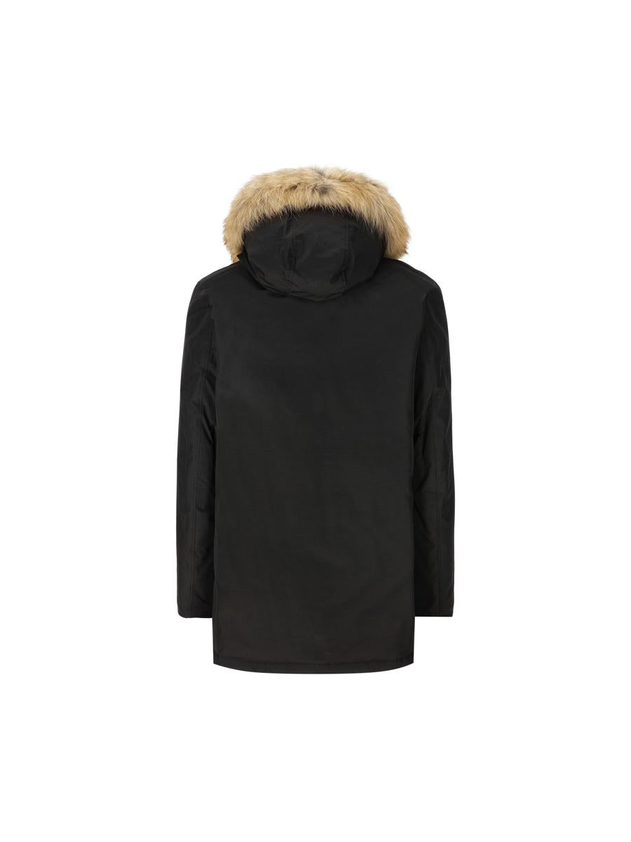 The Woolrich Arctic Parka is made of Ramar Cloth, an iconic fabric from the brand that is wind and water resistant. Duck down filling and a hood finished with removable fur offer insulation and protection in harsh climates. The functional design, with patch pockets and concealed front closure, reflects the timeless, technical approach of Woolrich outerwear. - Material: Ramar Cloth outer fabric (60% cotton, 40% nylon) - Color: black - Lining: 100% polyamide - Filling: 80% gray duck down, 20% Feather - Protective hood with detachable coyote fur insert - Zip and button closure - Handwarmer pockets - Flap and button patch pockets - Inside pockets - Ribbed inner cuffs - Thermicity scale: Intense cold -20 °C / -10 °C - Item code: CFWOOU0482MRUT0001BLK