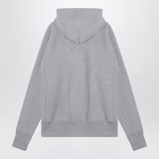 Light grey plush cotton sweatshirt from Champion featuring a hood with drawstring, a kangaroo pocket on the front, a front zip fastening, long sleeves with a small logo patch on the wrist and ribbed edges.