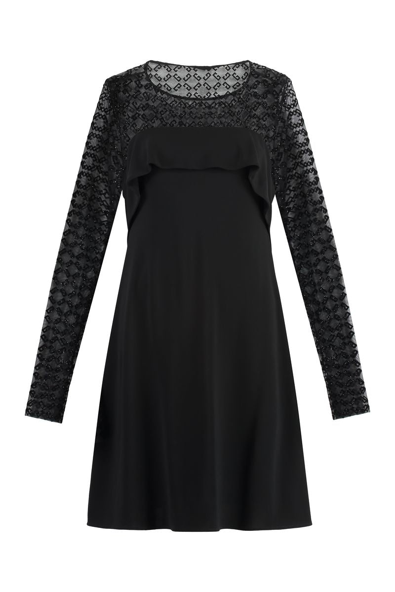 Givenchy Black Dress. Crafted in polyamide and elastane blend. Round neck, long sleeves, short-length, straight hem, tonal stitching. Tulle fabric with tonal velvet signature G monogram logo, back draped design, integrated bodysuit with snap fastening.