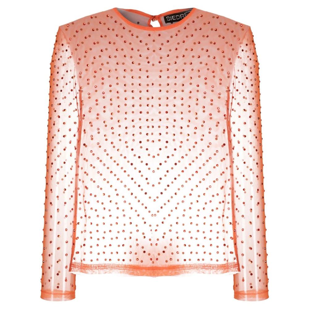 Carrot orange crystal embellishment sheer micro-mesh panels crew neck rear button fastening long sleeves straight hem